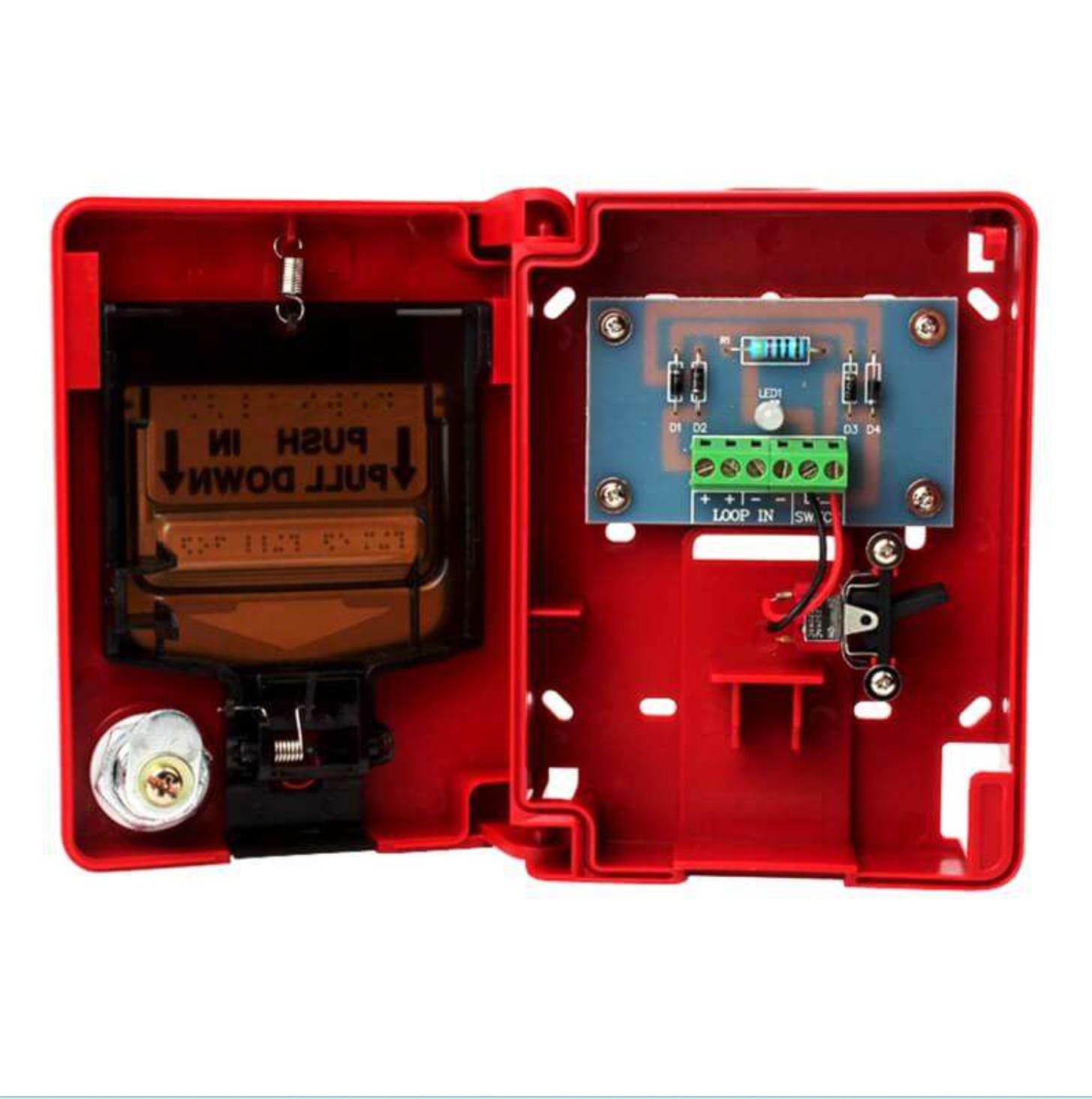 Conventional manual call point is designed to be use with an intelligent two-wire control system. If it is pressed after a fire is manually confirmed, an alarm signal sent to a fire alarm control system which will, after receiving the alarm signal, display the equipment status of the manual fire call points. When the manual fire call points is operating normally, the red indicator will blink;when there is a fire alarm, it will remain lit.
